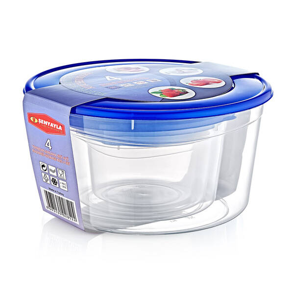 Mutfakta gıdalarınızı düzenli, hijyenik ve taze bir şekilde saklamak için tasarlanan 4’lü Derin Saklama Kabı Seti, farklı boyutları sayesinde hem sıvı hem de katı gıdalar için çok yönlü kullanım imkânı sunar. Şeffaf gövdesiyle içerisindeki yiyecekleri kolayca görebilirsiniz.Her kap, hava geçirmez ve sızdırmaz mavi kapağı sayesinde gıdaların tazeliğini korur. BPA içermeyen, dayanıklı plastikten üretilmiş olup gıda ile temasa uygundur. Set, salata, çorba, kahvaltılık, kuruyemiş veya yemek saklamak için idealdir. Ayrıca iç içe geçebilen yapısı sayesinde dolaplarda yer tasarrufu sağlar.Uzun ömürlü yapısı ve pratik kapak tasarımıyla buzdolabında, mutfak dolaplarında veya pikniklerde güvenle kullanılabilir.