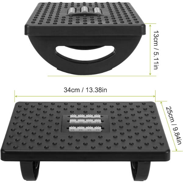 Ayak destek ve masaj aleti, masa başında çalışanlar için ergonomik rahatlık sunarken ayak sağlığını destekleyen özel bir tasarıma sahiptir. 34 cm x 25 cm ölçülerindeki bu ürün, 13 cm yüksekliğe sahiptir ve alt kısmında yer alan bombeli denge yapısı sayesinde ayak hareketlerini doğal şekilde destekler. Yüzeyindeki çıkıntılı masaj dokusu ve ortasında bulunan 3 adet masaj rulosu ile ayak tabanına baskı uygulayarak kan dolaşımını artırır. Kaymaz mat yüzeyi sayesinde güvenli bir kullanım sunar. 180 derece eğim kabiliyetiyle ayakların konumunu rahatça ayarlayabilir. Hem evde hem ofiste kullanılmak üzere ideal ve taşınabilir bir çözümdür.