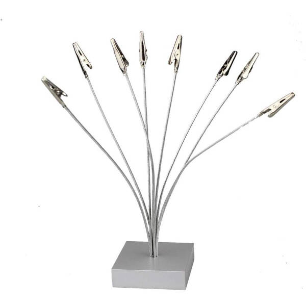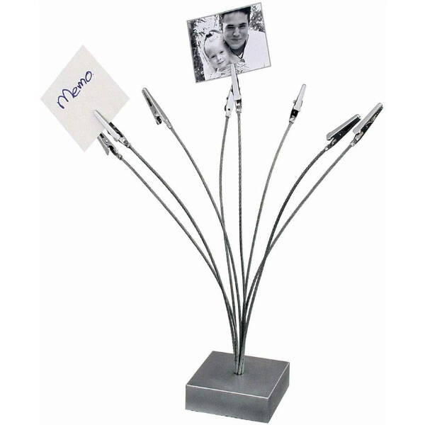 Esnek metal telleri sayesinde farklı yükseklik ve açıları kolayca ayarlayabilir, belgeleri estetik bir biçimde konumlandırabilirsiniz. Sağlam tabanı devrilmeyi önlerken, paslanmaz çelikten üretilmiş kıskaçları uzun ömürlü kullanım sunar. Minimalist ve modern tasarımıyla masa üstü dekorasyonuna da zarif bir dokunuş katar.