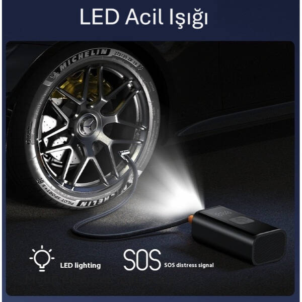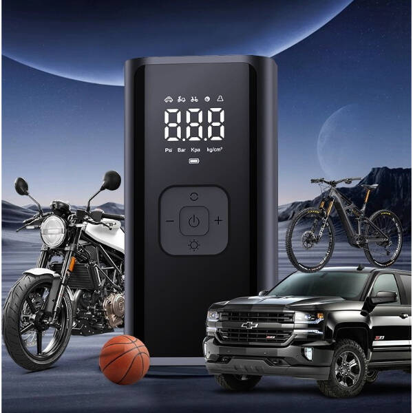 LCD göstergeli 3'ü 1 arada hava kompresörü, 4.500 mAh batarya kapasitesi, 78W gücü ve 150 PSI basınç desteği ile güçlü ve pratik bir çözüm sunar. Araç lastikleri, motosikletler, bisikletler ve toplar için kullanılabilir. Powerbank özelliği sayesinde acil durumlarda cihazlarınızı şarj edebilir, LED ışığı ile gece kullanımlarında ek aydınlatma sağlar. Kompakt tasarımı ve dijital ekranı sayesinde kolay taşınabilir ve basınç değerlerini anlık olarak takip etme imkânı sunar. USB şarj özelliği ile her yerde şarj edilerek kullanılabilir.