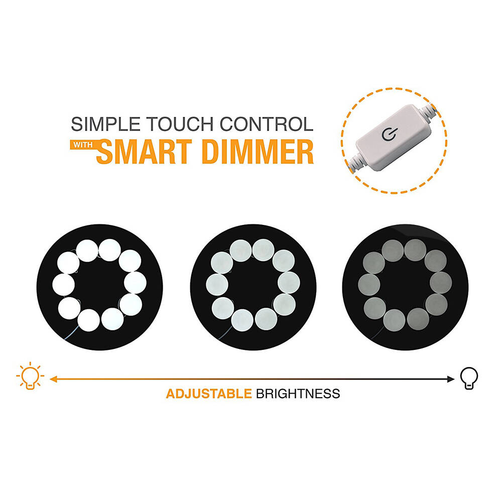 MAKYAJ AYNASI AYDINLATMA KİTİÜrün ÖzellikleriDC 12V çıkış voltajı, kullanımı güvenlidir. 10 adet G5 modern küresel ampul.Yapışabilir ışık pürüzsüz yüzey doğrudan veya kullanım vidaları (dahil değildir) işığı düzeltmek için. Her bir ampulün altındaki bir tel yuvasında yerleşik olarak, yedek kabloyu içine koymanıza izin verir, maks. Her lamba arasındaki mesafe 25.5cm, ampul tel uzunluğunu ihtiyacınıza göre ayarlayın.Yenilik dokunmatik kontrol anahtarı ve kademesiz dimmer. Göz kamaştırıcı değil, kademesi kısılabilir, uzun dokunmatik dimmer ile parlaklığı 20% ila 100% arasında ayarlayın.Karartma hafıza fonksiyonuna sahiptir.Paket İçeriği1 adet makyaj aynası aydınlatma kiti ( 10 adet ampul)
