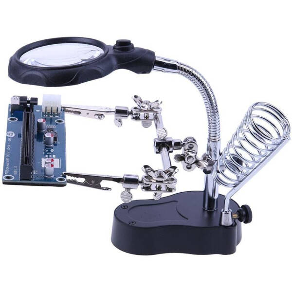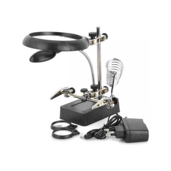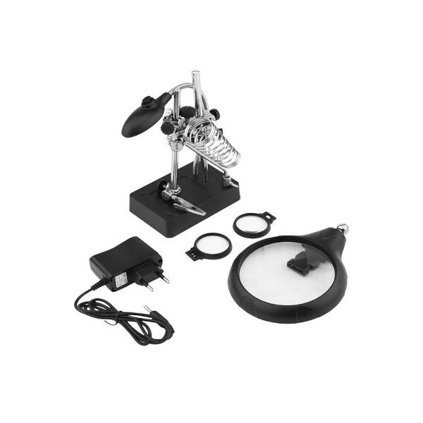 MERCEKLİ HAVYA STANDIÜrün ÖzellikleriMercekli havya standı, özellikle lehimleme işleri, elektronik tamirat ve hassas montaj işlemleri için mükemmel bir yardımcı ekipmandır. Büyüteçli yapısı ve işlevsel tasarımı sayesinde hassas işler için kolaylık sunar. Hem profesyonel kullanıcılar hem de hobi severler için ideal olan bu ürün, sağlam metal gövdesi ve çeşitli özellikleriyle uzun ömürlü ve güvenli bir kullanım sağlar.Üzerinde bulunan havya tutucu, lehimleme sırasında güvenli bir çalışma ortamı sağlar. İki adet hareketli ve ayarlanabilir klips, çalışma parçalarını sabitlemek için idealdir. Sağlam ve dayanıklı metal yapı, uzun ömürlü kullanım sağlar. LED ışık veya entegre aydınlatma, çalışma alanını yeterince aydınlatır. Ürünü enerjiyle çalıştırmak için adaptör dahildir. Elektronik devre elemanlarının birleştirilmesi sırasında büyük kolaylık sağlar. Saat, mücevher ya da küçük cihazların tamiratında kullanılabilir. Modeller, maketler veya el işi projelerinde hassas çalışma imkanı sunar.Paket İçeriği1 Adet Mercekli Havya Standı1 Adet Elektrik Adaptörü