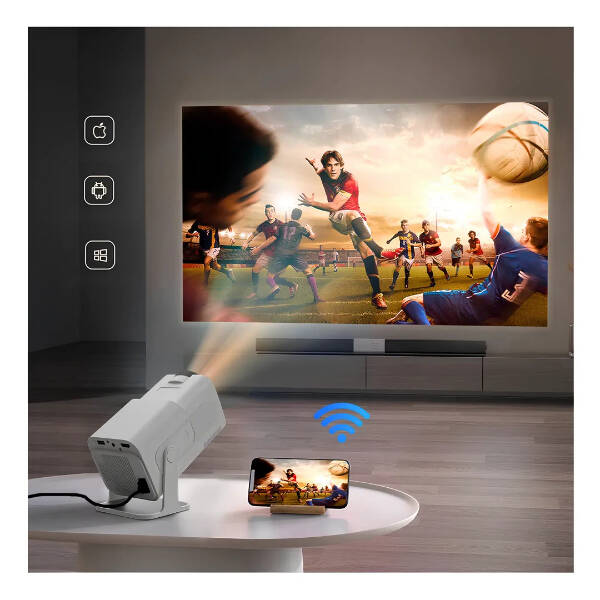 Evde, ofiste veya açık havada sinema keyfini yaşamak isteyenler için tasarlanan Mini Taşınabilir Projeksiyon, güçlü performansı ve şık kompakt tasarımıyla dikkat çekiyor. 150 inçe kadar dev ekran yansıtma özelliği sayesinde gerçek sinema deneyimini her ortamda yaşamanıza olanak tanır.Full HD 1080P çözünürlüğün yanı sıra 4K Ultra HD destekli bu akıllı projektör, 220 ANSI lümen parlaklık değeriyle son derece net, canlı ve kontrastı yüksek görüntüler sunar. Dahili Android sistemi, Netflix, YouTube ve 400’den fazla uygulamaya doğrudan erişim imkânı sağlar. Bluetooth ve Wi-Fi bağlantısı sayesinde kablosuz kullanım kolaylığı sunarken, tüm Android ve iOS cihazlarla tam uyumluluk gösterir.1GB RAM + 8GB dahili hafıza donanımıyla akıcı bir performans sunar ve film, sunum veya oyun deneyiminde kesintisiz bir kullanım sağlar. Dahili hoparlör, yüksek ses kalitesiyle ek ses sistemine ihtiyaç duymadan güçlü bir ses deneyimi yaşatır. 180° dönebilen başlığı, cihazı istediğiniz açıdan kolayca konumlandırmanızı sağlar.Kompakt yapısı ve kolay taşınabilirliğiyle iş toplantılarında, seyahatlerde veya ev sineması kurulumlarında ideal bir seçimdir.