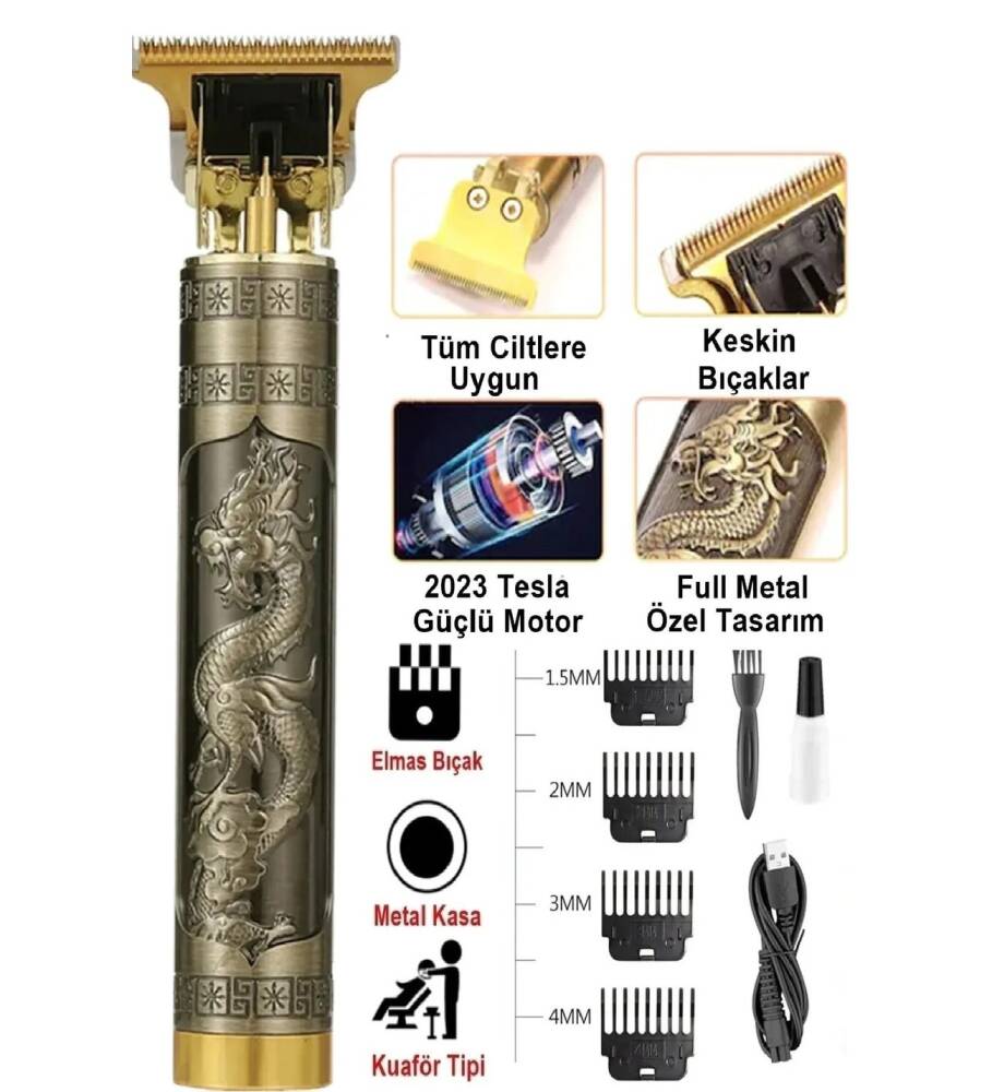PROFESYONEL TIRAŞ MAKİNESİProfesyonel Tıraş Makinesi: Keskinlik ve Tarzın BirleşimiProfesyonel Tıraş Makinesi, mükemmel tıraş deneyimi ve şıklığı bir araya getiren özel tasarımıyla erkeklerin tercihi olmaya adaydır. Metal gövdesi ve ejderha işlemeli detaylarıyla dikkat çeken bu ürün, güçlü performansı ve kullanışlı özellikleriyle tıraş deneyimini bir üst seviyeye taşır.Metal Gövde ve Ejderha İşlemeli DetaylarDayanıklı metal gövdesiyle Profesyonel Tıraş Makinesi, uzun ömürlü bir kullanım sağlar ve şık bir görünüm sunar. Üzerindeki ejderha işlemeli detaylar, ürüne benzersiz bir karakter katar ve kullanıcısına kendini özel hissettirir.4 Farklı Kesim UcuHer türlü saç tipi ve tarzı için ideal olan Profesyonel Tıraş Makinesi, 4 farklı kesim ucuyla gelir. Bu uçlar, istenilen uzunluk ve tarzda tıraş imkanı sunar ve kullanıcıya özgür bir seçenek sunar.Kolay Bakım ve TemizlikTıraş makinesini temizlemek ve bakımını yapmak hiç bu kadar kolay olmamıştı! Ürünün bir parçası olarak gelen bıçak temizleme fırçası, kullanıcıya tıraş sonrası temizlik için pratik bir çözüm sunar. Ayrıca, mini yağ ile bıçakları düzenli olarak yağlamak, keskinliğini ve performansını korumasına yardımcı olur.USB Şarj Kablosu ile Pratik ŞarjProfesyonel Tıraş Makinesi, USB şarj kablosuyla birlikte gelir. Bu özellik, kullanıcıya evde veya seyahatte kolayca şarj etme imkanı sunar. Pil ömrü endişesi olmadan istediğiniz zaman ve yerde kullanabilirsiniz.SonuçProfesyonel Tıraş Makinesi, yüksek performansı, şık tasarımı ve kullanıcı dostu özellikleriyle tıraş deneyimini bir adım öteye taşır. Her detayı özenle düşünülmüş bu ürün, kullanıcıya güven verir ve her kullanımda mükemmel sonuçlar sağlar.