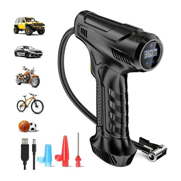 Şarjlı el tipi hava kompresörü kompakt yapısıyla kolay taşınabilir ve pratik kullanım sağlar. 3600 mAh bataryaya sahip olan cihaz, güçlü 120 W motoru sayesinde hızlı şişirme imkanı sunar. Dijital ekranlı tasarımıyla basınç değerlerini net bir şekilde gösterir ve kullanım kolaylığı sağlar. Araç lastikleri, bisiklet, motosiklet, top ve çeşitli şişme ürünlerde rahatlıkla kullanılabilir. USB üzerinden şarj edilebilir yapısıyla enerji tasarrufu sunar ve farklı uç adaptörleri sayesinde çok yönlü bir kullanım sağlar.